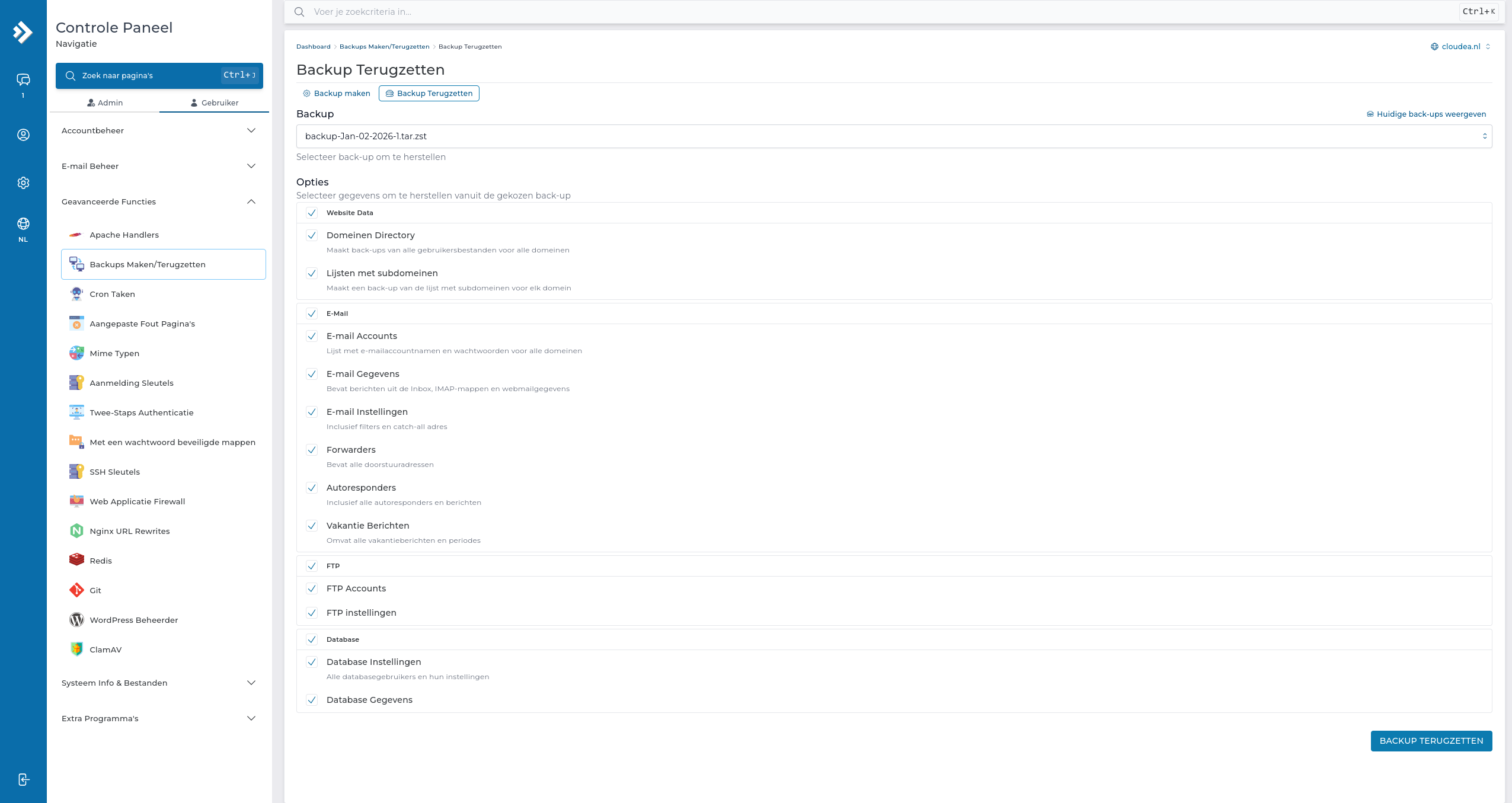 backup-Maand-Dag-Jaar-nummer.tar.gz). - Scroll naar beneden en klik op Backup Terugzetten